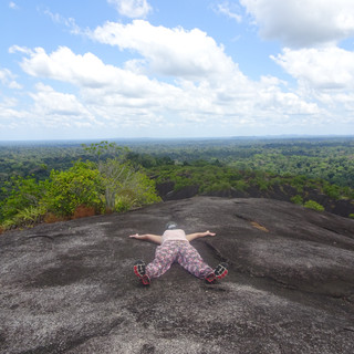 Deze tweede dag gingen we de Voltzberg beklimmen en daarna afkoelen bij een kleine waterval (stroomversnelling). Lange broek aan, pet op, ingesmeerd met zonnebrand en deet, liters water mee en ik was er helemaal klaar voor! Lets go. Wij hadden gehoord dat dit appeltje eitje was in vergelijking met de kasikasima. Nou, dat moest ons lukken. Niet wetende dat dit 16 'Surinaamse' kilometers zou zijn en dat deze wandeltocht van 9 tot 5 zou duren. We hebben ruim 7 uur gelopen. Wow, dit was zo heavy.. Dit had ik nooit verwacht. Het was loodzwaar. Ik liep achterop, want het tempo was mij te snel en anders zou ik letterlijk die berg afrollen. Na uren in de jungle te hebben gewandeld kwam de berg in zicht. Dit was het moment. Camera's weg en niets meer in je handen.. Want jawel.. We gingen stijl omhoog. Via touw, rotsen en linianen klommen we omhoog. En dan denk je 'I survived' but things get worst😂. We moesten STIJL de berg op. Gelukkig had ik goeie schoenen aan. De meeste beesten die ik vooral heb gezien waren steekvliegen. Gewoon vliegen, maar dan groter en vervelender (de naam zegt het al). Gelukkig had ik de gids achter me en maakte zo'n beetje om de zoveel tijd honderden steekvliegen dood. Dat scheelt. In deze tocht ben ik geloof ik maar 1 keer gestoken. De ademhaling in combinatie met de hitte vond ik het zwaarst. Jeetje. Ik kreeg weer de bekende after-workout-face. Rood-wit gevlekt, maar jawel.. De top bereikt!!!! Het eerste wat ik deed is kijken. En dan ook naar beneden. Wow, hebben we dat echt beklommen? Ergens ging ook de gedachte door me heen van: eh en ja..Hoe gaan we terug. Juist, je raadt het al: precies op dezelfde weg terug. Huilen. Maar eerst een foto. Plat op de berg, zo voelde ik mij. Na aantal fotosessies en genieten van het uitzicht was het tijd om terug te gaan. Doodeng. Stijl naar beneden, stap voor stap weer terug naar het begin. Ik weer als laatste natuurlijk, maar hier alvast je gouden tip: het is niet erg om achter te blijven ( als je maar met een gids bent), want als je met zn tweeën loopt, zie je zoveel meer. Zo hadden we de aapjes gezien. Eerst het geluid en toen kwamen er bladeren uit de boom vallen. Snel de camera erbij en filmen maar. Ze sprongen van boom naar boom en klommen via de linianen verder. Kapsuizen aapjes werden ze genoemd. Zelfs een aapje met een baby op zijn rug. Dat was een mooi moment. De terugweg had ik het wel zwaar. Ik snakte naar zwemmen. Verkoeling. Gelukkig ging de tijd wat sneller door te babbelen met de gids. Een aardige man die Wilfred. Yes daar zijn we dan!!! Ik kon nu eindelijk zwemmen. Eerst even badpak aandoen.. toch niet zo handig midden in de jungle. Ik had helemaal warmte uitslag gekregen op mijn bovenbenen van de hitte, maar gelukkig kon ik snel de verkoeling opzoeken. Na ongeveer 5 minuten zei de andere gids dat we gingen vertrekken. Tsja.... elk voordeel heeft dus ook zijn nadeel😂. We gingen weer terug. We hebben wederom savonds weer heerlijk gegeten en kaartspelletjes gespeeld met een glaasje Surinaamse rum. Hmm lekker Borgous! Trouwens.. ik heb vis gegeten! Het was een zware dag, maar echt de moeite waard!!